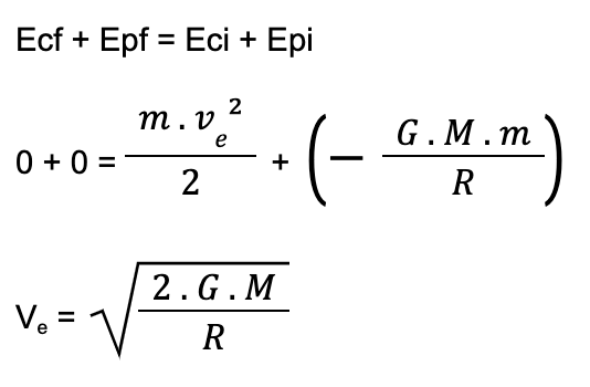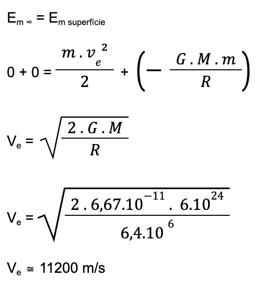 Nesse sentido, temos que falar da velocidade de escape (Ve). Trata-se da velocidade necessária para que o corpo escape da ação gravitacional do planeta, isto é, para que ele não fique preso na órbita. Queremos, portanto, saber a velocidade mínima necessária para que esse corpo escape e se perca no infinito, quando ele para.