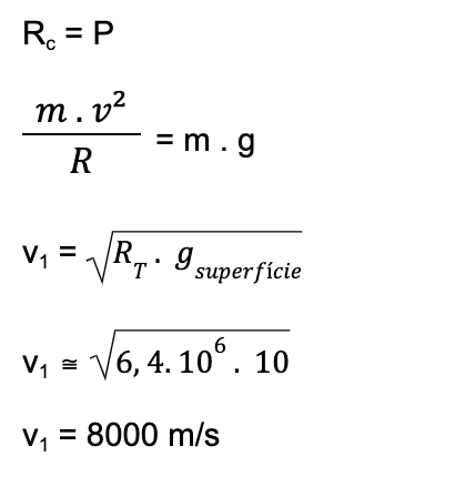 Para calcular essa velocidade, temos que considerar que a força gravitacional atua como variante centrípeta. Assumindo que a Resultante Centrípeta é igual ao Peso (Rc = P), temos que: