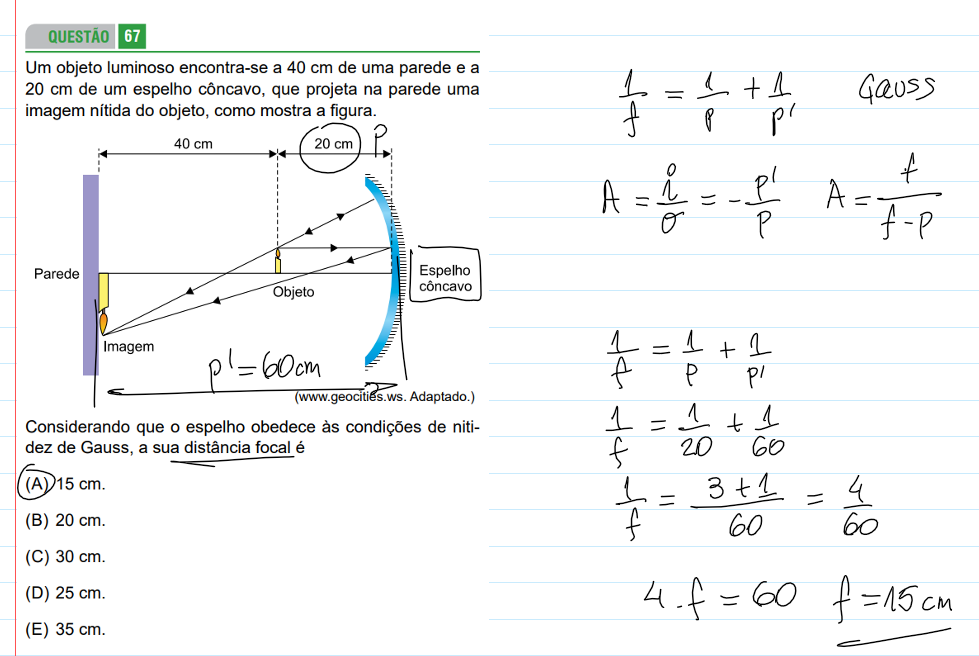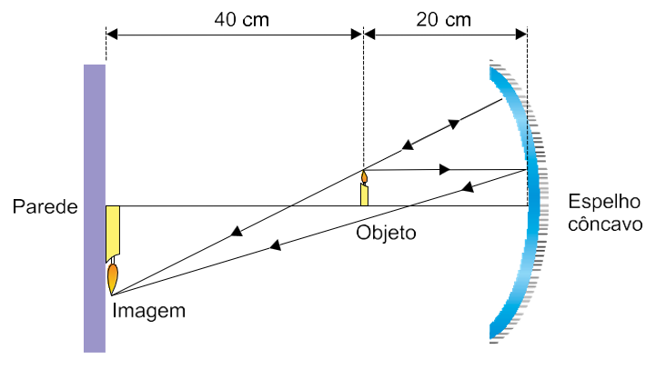 Um objeto luminoso encontra-se a 40 cm de uma parede e a 20 cm de um espelho côncavo, que projeta na parede uma imagem nítida do objeto, como mostra a figura.