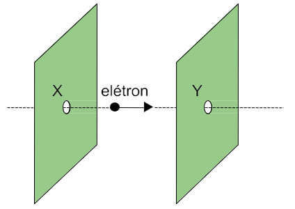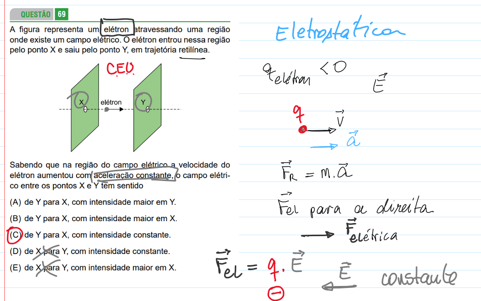 Sabendo que na região do campo elétrico a velocidade do elétron aumentou com aceleração constante, o campo elétri- co entre os pontos X e Y tem sentido