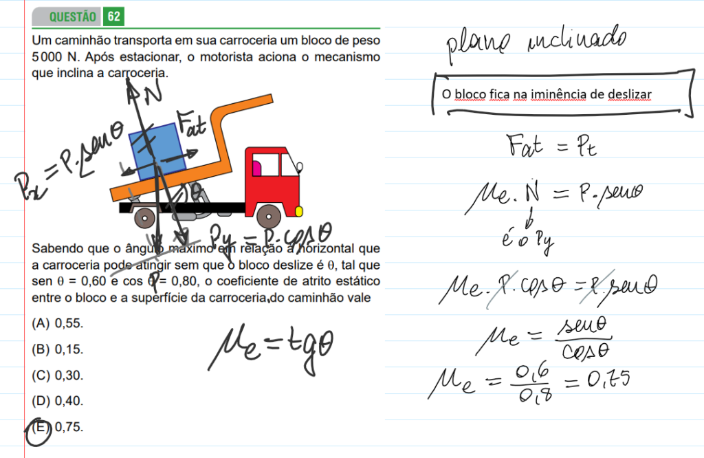 Sabendo que o ângulo máximo em relação à horizontal que a carroceria pode atingir sem que o bloco deslize é , tal que sen q = 0,60 e cos q = 0,80, o coeficiente de atrito estático entre o bloco e a superfície da carroceria do caminhão vale