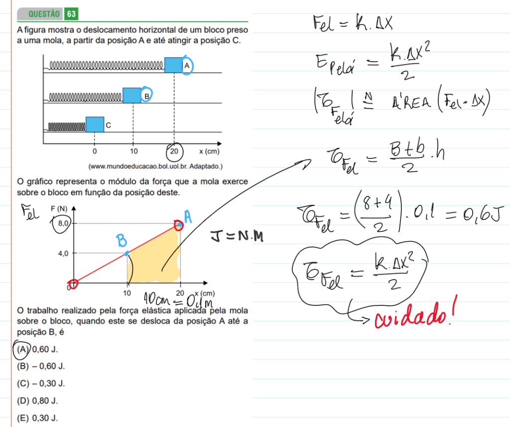 O trabalho realizado pela força elástica aplicada pela mola sobre o bloco, quando este se desloca da posição A até a posição B, é