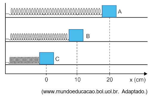 63. (Famerp 2018) A figura mostra o deslocamento horizontal de um bloco preso a uma mola, a partir da posição A e até atingir a posição C.