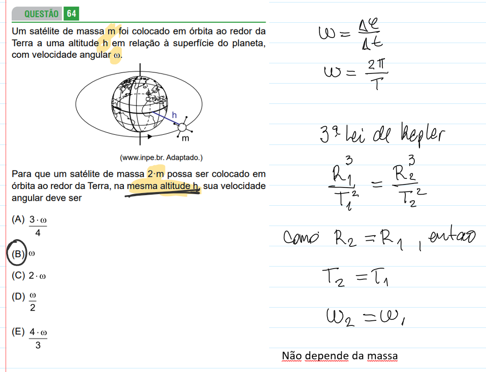 Para que um satélite de massa 2·m possa ser colocado em órbita ao redor da Terra, na mesma altitude h, sua velocidade angular deve ser