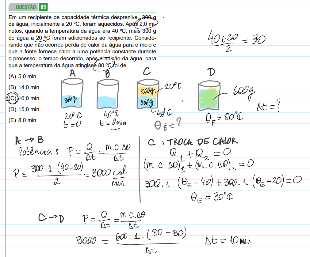 65. (Famerp 2018) Em um recipiente de capacidade térmica desprezível, 300 g de água, inicialmente a 20 ºC, foram aquecidos. Após 2,0 minutos, quando a temperatura da água era 40 ºC, mais 300 g de água a 20 ºC foram adicionados ao recipiente. Conside- rando que não ocorreu perda de calor da água para o meio e que a fonte fornece calor a uma potência constante durante o processo, o tempo decorrido, após a adição da água, para que a temperatura da água atingisse 80 ºC foi de