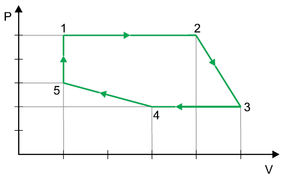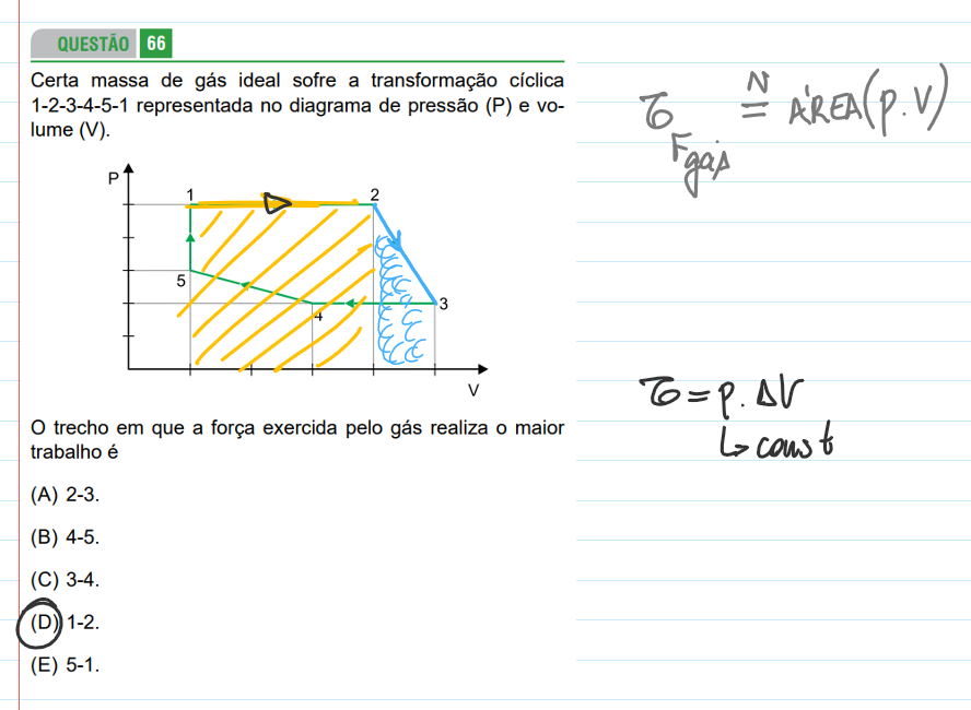 65. (Famerp 2018) Certa massa de gás ideal sofre a transformação cíclica 1-2-3-4-5-1 representada no diagrama de pressão (P) e volume (V).