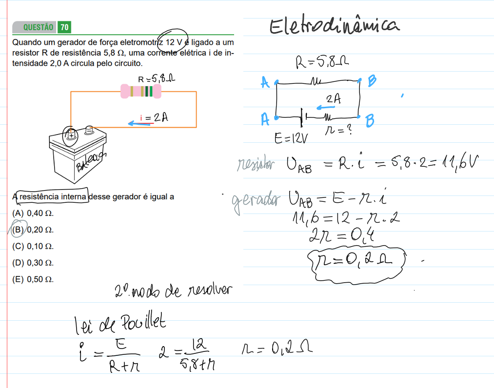 70. (Famerp 2018) Quando um gerador de força eletromotriz 12 V é ligado a um resistor R de resistência 5,8 W, uma corrente elétrica i de intensidade 2,0 A circula pelo circuito.
