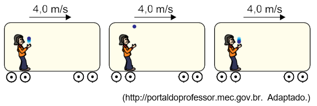 61. (Famerp 2018) No interior de um vagão hermeticamente fechado que se move horizontalmente em trajetória retilínea com velocidade 4,0 m/s em relação ao solo, uma pessoa arremessa uma pequena esfera verticalmente para cima, com velocidade 3,0 m/s em relação ao vagão.