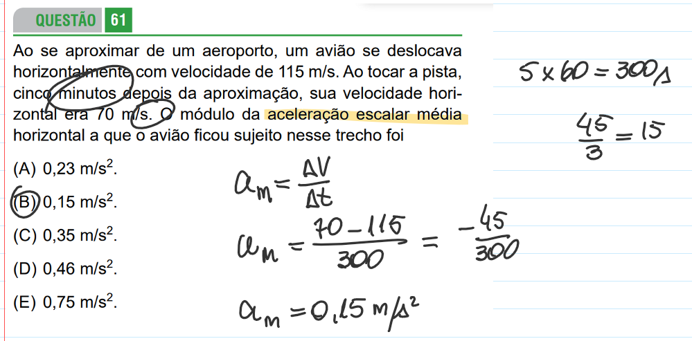 61. Ao se aproximar de um aeroporto, um avião se deslocava horizontalmente com velocidade de 115 m/s. Ao tocar a pista, cinco minutos depois da aproximação, sua velocidade horizontal era 70 m/s. O módulo da aceleração escalar média horizontal a que o avião ficou sujeito nesse trecho foi