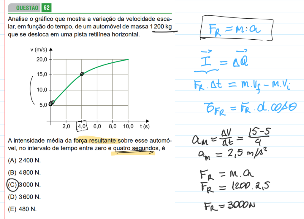 62. Analise o gráfico que mostra a variação da velocidade escalar, em função do tempo, de um automóvel de massa 1 200 kg que se desloca em uma pista retilínea horizontal.