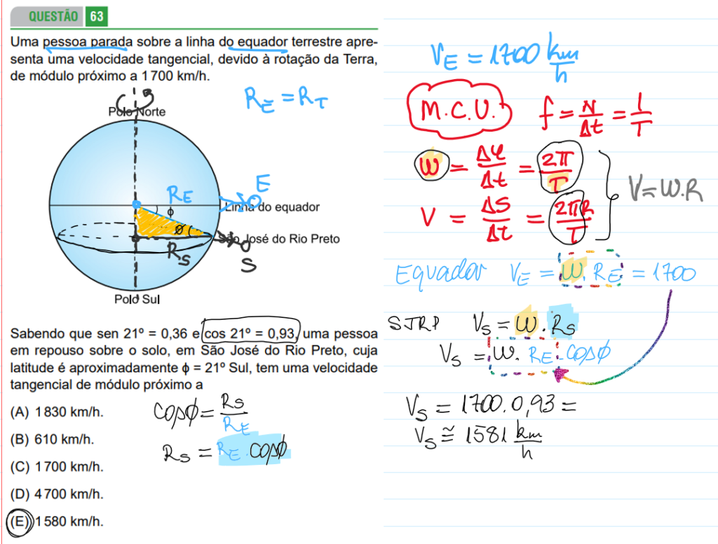 Sabendo que sen 21º = 0,36 e cos 21º = 0,93, uma pessoa em repouso sobre o solo, em São José do Rio Preto, cuja latitude é aproximadamente ϕ = 21º Sul, tem uma velocidade tangencial de módulo próximo a
