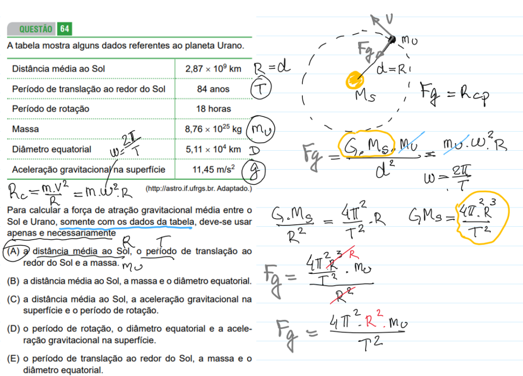 Para calcular a força de atração gravitacional média entre o Sol e Urano, somente com os dados da tabela, deve-se usar apenas e necessariamente