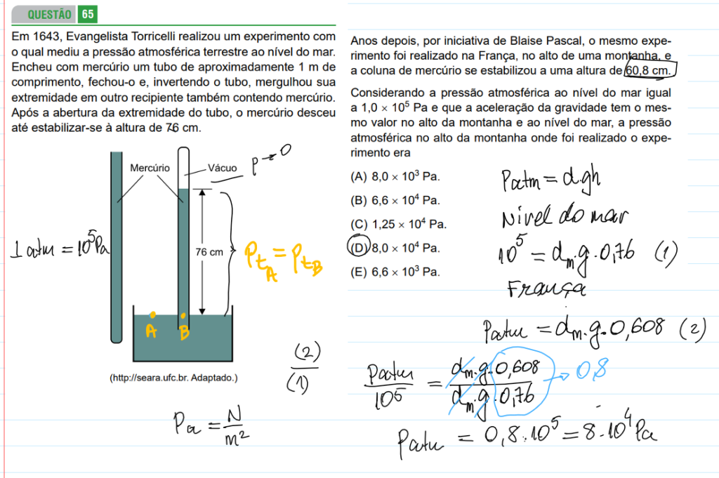 65. Em 1643, Evangelista Torricelli realizou um experimento com o qual mediu a pressão atmosférica terrestre ao nível do mar. Encheu com mercúrio um tubo de aproximadamente 1 m de comprimento, fechou-o e, invertendo o tubo, mergulhou sua extremidade em outro recipiente também contendo mercúrio. Após a abertura da extremidade do tubo, o mercúrio desceu até estabilizar-se à altura de 76 cm.