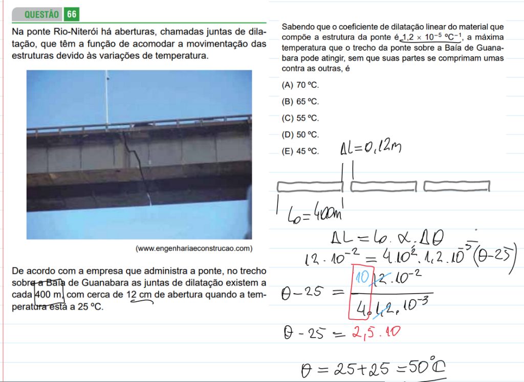 Sabendo que o coeficiente de dilatação linear do material que compõe a estrutura da ponte é 1,2.10– 5 ºC-1, a máxima temperatura que o trecho da ponte sobre a Baía de Guanabara pode atingir, sem que suas partes se comprimam umas contra as outras, é