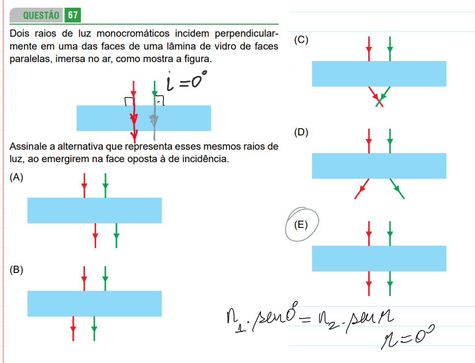 67. Dois raios de luz monocromáticos incidem perpendicularmente em uma das faces de uma lâmina de vidro de faces paralelas, imersa no ar, como mostra a figura.