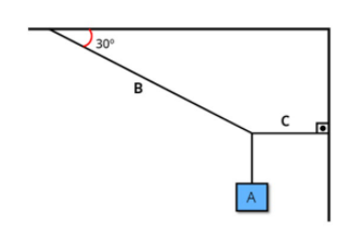 (Ifsul) Uma caixa A, de peso igual a 300 N, é suspensa por duas cordas B e C conforme a figura a seguir. (Dados: sen 30º = 0,5)