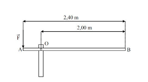 Uma cancela manual é constituída de uma barra homogênea AB de comprimento L = 2,40 m e massa M = 10,0 kg e está articulada no ponto O, onde o atrito é desprezível. A força F tem direção vertical e sentido descendente, como mostra a figura acima. Considerando a aceleração da gravidade g = 10,0 m/s2, a intensidade da força mínima que se deve aplicar em A para iniciar o movimento de subida da cancela é: