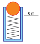 A figura mostra uma esfera, de 250 g, em repouso, apoiada sobre uma mola ideal comprimida. Ao ser liberada, a mola transfere 50 J à esfera, que inicia, a partir do repouso e da altura indicada na figura, um movimento vertical para cima