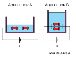 Dois aquecedores elétricos, A e B, que contêm massas diferentes de água, mA e mB, à mesma temperatura inicial, foram montados com quatro resistores idênticos. No aquecedor A, dois desses resistores estão ligados em série. No aquecedor B, os outros dois resistores estão ligados em paralelo. Nos dois casos, os aparelhos são ligados à mesma diferença de potencial, U, constante.