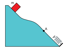 Uma caixa de massa m é abandonada no alto de uma superfície com atrito, choca-se, no ponto mais baixo, com uma mola ideal fixa e volta a subir. Nesse movimento, a caixa passa duas vezes pelo ponto A: na descida, com velocidade v1, e na subida, com velocidade v2.