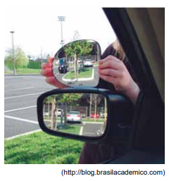 Para demonstrar a vantagem de se utilizar espelhos convexos ao invés de planos na montagem de retrovisores de veículos, foi feita a fotografia a seguir, em que se comparam os campos visuais dos dois espelhos.