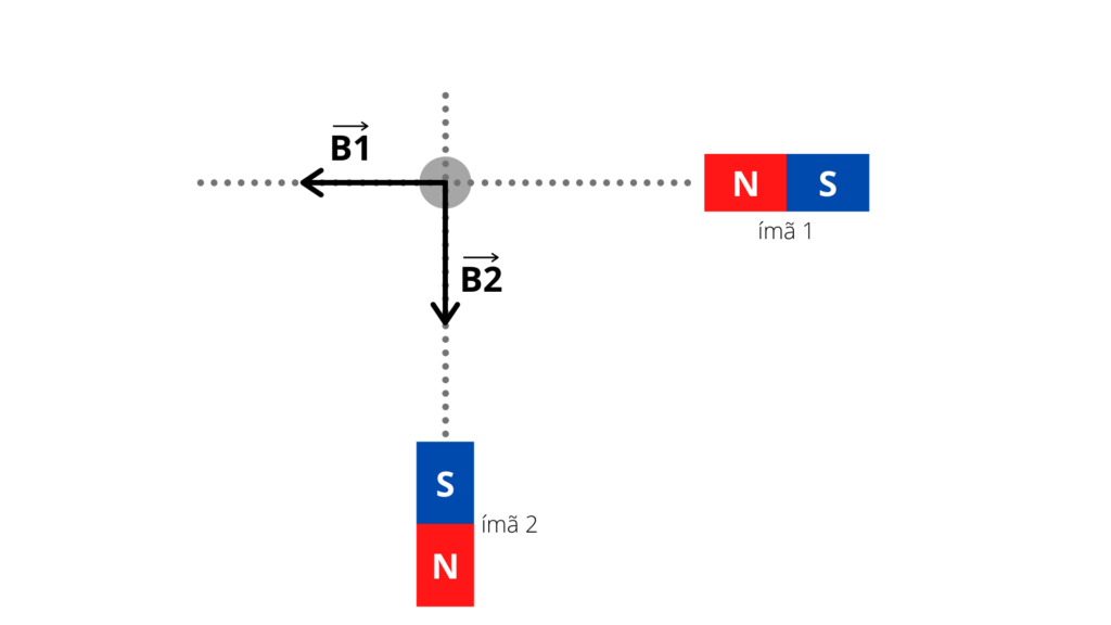 - O polo norte no ímã 2 gera um campo magnético para a esquerda (B2).