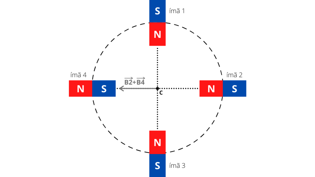 Quando temos ímãs iguais e à mesma distância, o campo B3 irá anular o campo B1, ou seja, no eixo y, não há campo resultante. Assim, devemos somar B2 e B4. Veja: