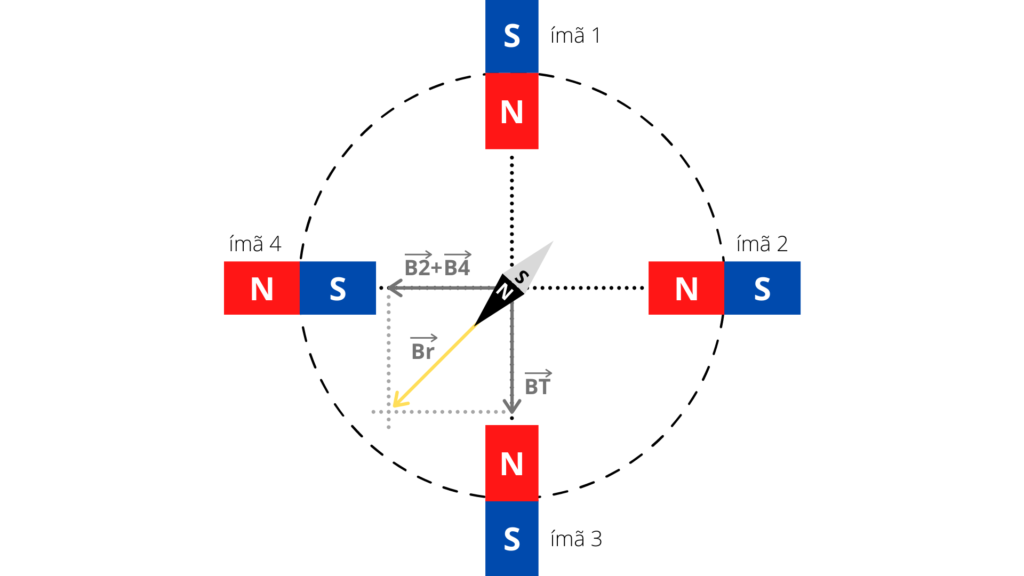 - Repare, agora, que o ímã 4 não tem os polos orientados da mesma forma. Nesse caso, o polo sul será a entrada de um novo campo magnético (B4).