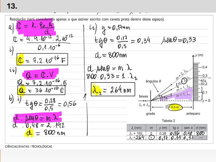 b) Na gravação de chips, grades de difração são usadas para a seleção de comprimentos de onda de feixes luminosos. A grade é formada por reentrâncias que dispersam a luz em diferentes direções (ângulos q no diagrama apresentado no espaço de resposta) em função do comprimento de onda. Quando a luz incide perpendicularmente à grade, a relação entre o comprimento de onda l e o ângulo de difração q é dada por d . senq = ml, sendo d o espaçamento entre as reentrâncias da grade e m = 1, 2, 3… No diagrama, são repre- sentados dois feixes de laser, um deles de comprimento de onda l1 = 192 nm, e outro de comprimento l2 a ser determinado. Fazendo uso do diagrama e da Tabela 1, complete corretamente a Tabela 2, apresentada no espaço de respostas, da seguinte maneira: