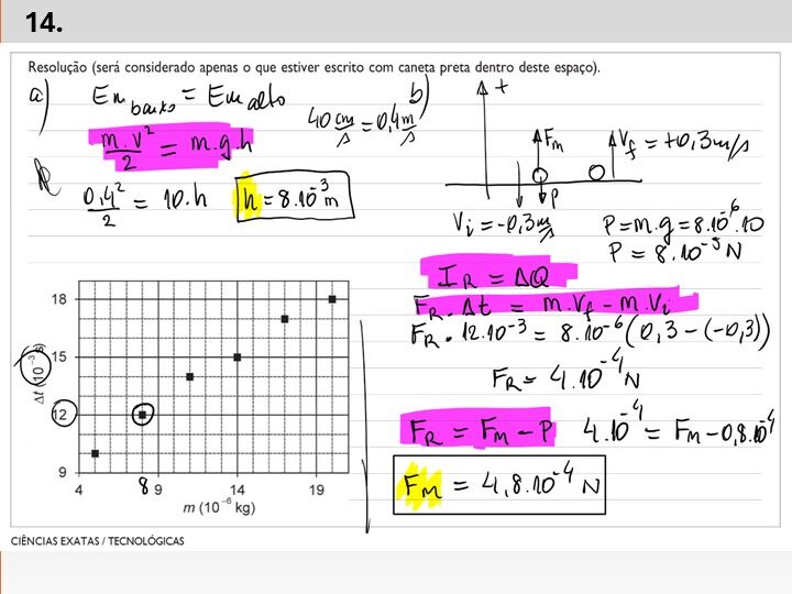 b) No estudo citado, gotas de água de diferentes diâmetros chegam à superfície hidrofóbica com velocidade de módulovinicial = 0,3 m/s , e afastam-se logo após a colisão, com coeficiente de restituição e =1. O gráfico no espaço de respostas mostra o intervalo de tempo Dt durrante o qual as gotas ficam em contato com a superfície em função da massa m da gota.