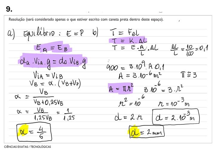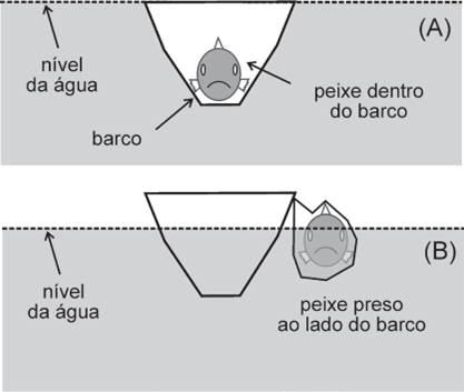 a) Um barco de pesca tem massa total mB , incluindo pescador e equipamen- tos, e consegue deslocar um volume máximo de água VB na iminência de ser inundado. Um peixe de massa mP e volume VP pode ser transportado no interior do barco ou amarrado do lado de fora. Com o peixe dentro, o barco fica na iminência de ser inundado (figura A); nesse caso, o volume de água deslocada pelo barco é VB. Já com o peixe amarrado fora do barco, o conjunto “barco + peixe” fica parcialmente submerso (figura B), com um volume de água deslocada igual a a.(VB + VP). Nesse último caso, qual é a fração submersa, a, se VP = 0,25 VB ?