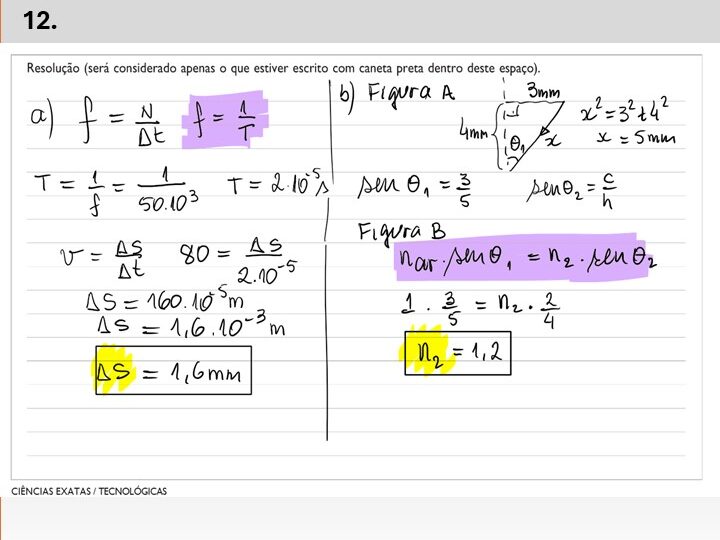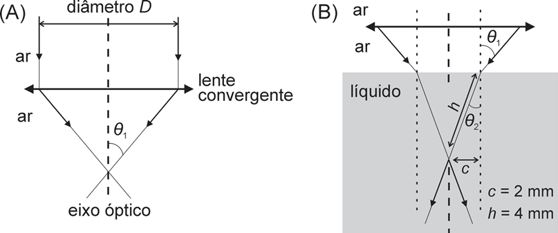 b) Para a escrita dos chips, uma lente objetiva é utilizada na focalização de um feixe luminoso na superfície. A figura A ilustra dois raios luminosos incidindo paralelamente ao eixo óptico de uma lente convergente de diâmetro D = 6,0 mm e distância focal F = 4,0 mm, imersa no ar (nar = 1). Para mudar a trajetória do feixe luminoso e melhorar o processo de gravação, usa-se um líquido entre a lente e a superfície. A figura B representa uma situação similar à da figura A, com os raios que emergem da lente adentrando um meio líquido. Qual é o índice de refração n2 do líquido?