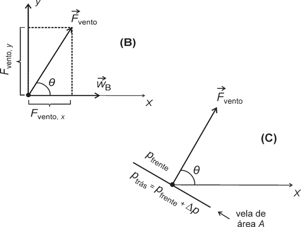 b) A figura B representa um barco a vela via- jando com velocidade constante de módulo wB = 3,0 m/s no sentido positivo do eixo x. Dentre as diferentes forças que atuam no barco, a força exerci- da pelo vento sobre a vela, Fvento , está representada na figura B e forma um ângulo q = 60o com a velo- cidade wB . Ao passar pela frente e por trás da vela de área A = 7,0 m2, o vento produz uma diferença de pressão média Dp = ptrás – pfrente = 300 N/m2 (ver figura C).