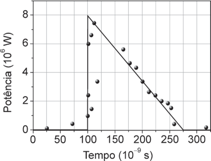 b) Um pulso de laser de comprimento de onda l = 10,5 mm é usado em um experimento de teste para a formação de plasma. A potência do laser, em função do tempo, tem o perfil de um triângulo retângulo, como representado na figura, de forma que a energia total do pulso é dada pela área sob a curva. Sabendo-se que a energia E de um fóton é dada por E = hf, sendo h = 7 ´ 10 –34 J·s e f a frequência da radiação, quantos fótons contém o pulso de laser?
