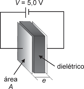 a) Parte de um dispositivo pertencente a um chip pode ser descrita como sendo formada por duas placas condutoras paralelas de área A = 2,0 mm2, separadas por um material dielétrico de espessura e = 0,1 mm e constante dielétrica K= 4. Esse conjunto forma um capacitor (ver figura), cuja capacitância C é diretamente proporcional à área das placas (A) e inversa- mente proporcional à espessura do dielétrico (e), sendo o fator de proporcionalidade dado por K e0 , com e0 = 9 ´ 10 –12 F/m. Pede-se: